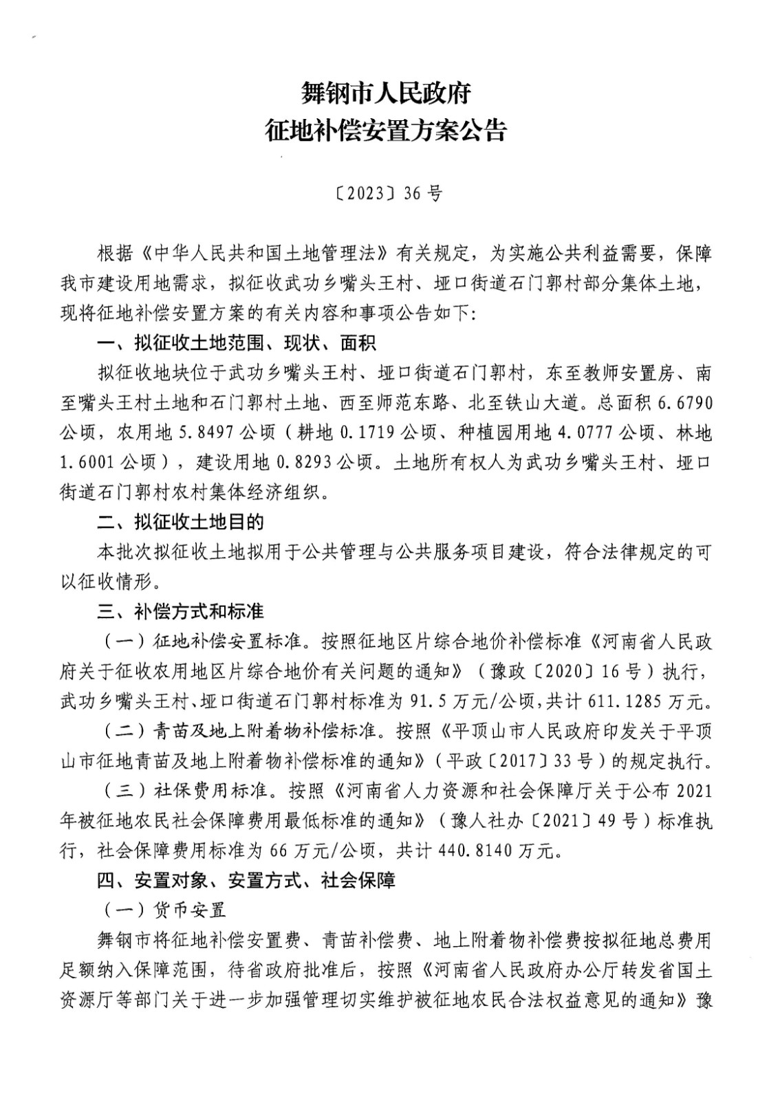 舞钢市人民政府征地补偿安置方案公告(垭口街道石门郭村、武功乡嘴头王村)