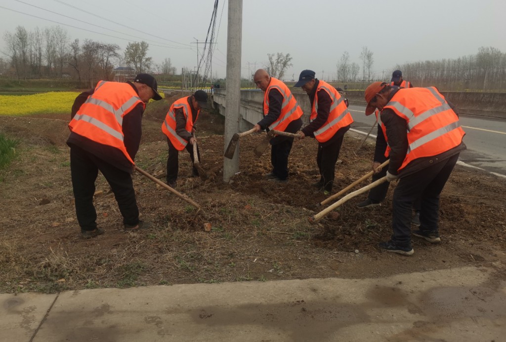 3月24日,在庙街乡干沟村主干道上,公益岗人员正身着反光黄马甲打扫整理卫生。